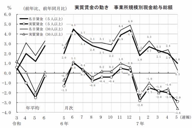 全産業平均は、現金給与総額が30万141円(同1.0%増)となり、41カ月連続でプラスとなっている。その一方で、実質賃金指数(※名目賃金指数を消費者物価指数で除して算出)は同2.9%減の82.8で、5カ月連続でマイナスとなった。