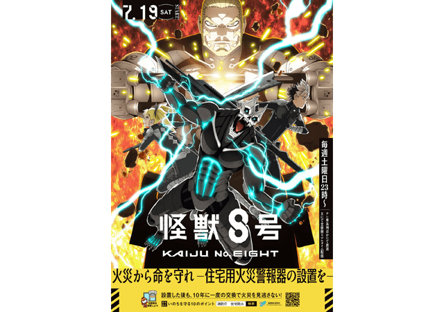 総務省消防庁は7月8日、住宅用火災警報器の広報の一環として、テレビアニメ『怪獣8号』(テレビ東京系列)とタイアップしたことを発表した。火災警報器の設置義務化から10年以上が経過したことから、広報用のポスターを作成し、10年経った機器を交換するよう呼び掛けている。