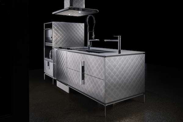 硬いステンレスを特殊プレス技術でダイヤ柄のキルティング模様に仕立て、表面には職人が手仕事でチタン研磨加工をほどこし、マットで上品な印象に仕上げた。
