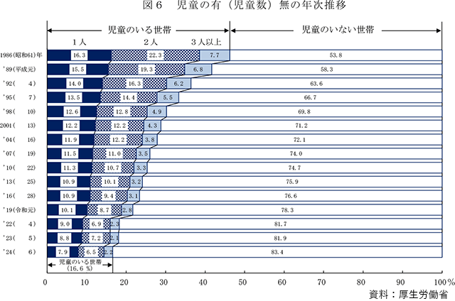 このうち児童のいる世帯は、907万4000世帯で全世帯の16.6%にとどまっている。児童の数は「1人」が47.7%で最も多く、「2人」は39.2%、「3人以上」は13.1%だった。児童のいる世帯は年々、減少している。