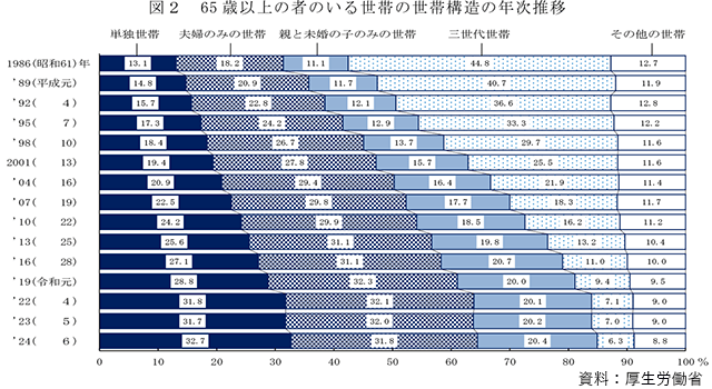 その一方で、「高齢者世帯」は全世帯の3割、「65歳以上の人がいる世帯」は約半数を占めており、いずれも世帯数・割合とも増加傾向にある。「65歳以上の人がいる世帯」の内訳は、「単独世帯」が32.7%、「夫婦のみの世帯」が31.8%、「未婚の子と同居」が20.4%などとなっている。