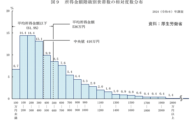 1世帯当たりの所得分布は、「100~200万円未満」「200~300万円未満」がそれぞれ14.4%、「300~400万円未満」が13.1%、「400~500万円未満」が9.9%などとなっている。平均所得金額は536万円で、前年調査よりも11万8000円上昇した。平均所得金額が最も高かったのは、「50~59歳」の750万円で、次いで「40~49歳」739万8000円、「60~69歳」612万1000円の順となった。最も低かったのは「29歳以下」で336万4000円だった。