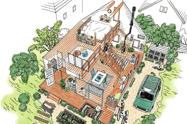 大きな吹き抜けと「まんなか階段」、約7.7mにおよぶ「インナーデッキ」など、従来のログハウスの魅力を継承しつつ、暮らしの中心を固定しない設計により、家族それぞれが自由に空間を楽しめる構成となっている。