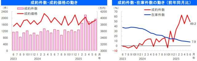 在庫件数は、4万4428件で前年同月比-0.7%と24年5月から14ヶ月連続で減少するも、ほぼ横ばいだった。