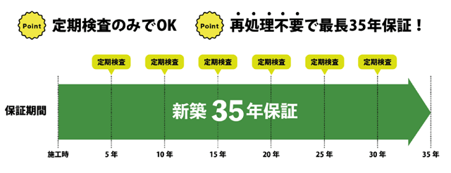 「新築35年保証」は、施工完了日から35・30・25・20年のいずれかを選択可能。定期検査は5年ごとに有償で実施し、合計300万円までの修復費用を保証する。シロアリ保証料は、35年3万5000円、30年3万円、25年2万5000円、20年2万円。