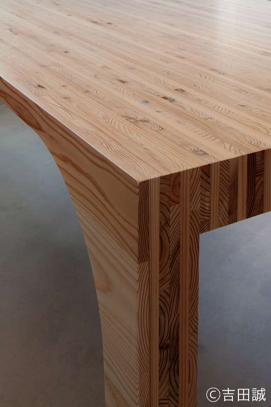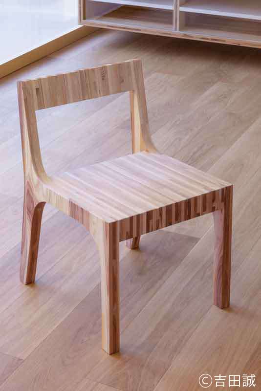 | 左:LAMINA-S(肘かけなし)。売上金の一部は、秋田県内の森林保護関係団体に寄付される 右:切り出した2種類の板を積層して構成したダイニングテーブル。天板に秋田杉の小口が大きく現れるよう最大限の魅力を表現した |