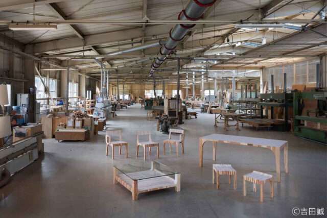 「ラミナ」はまず、12㎜厚の板状の秋田杉端材を直交するように重ねてCLTをつくり、そこからパーツを切り出して椅子やテーブルへと仕上げていく。