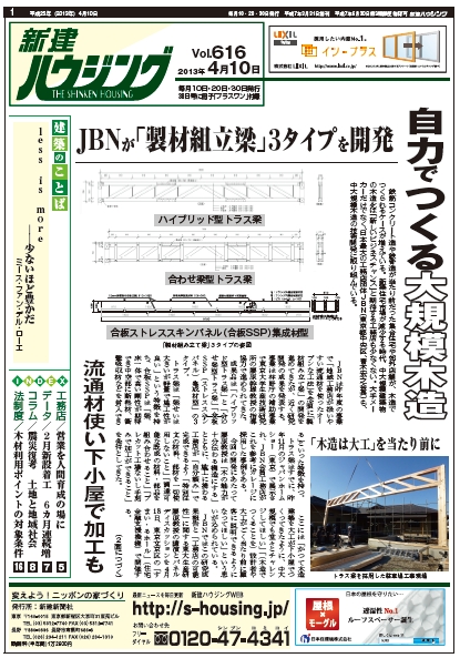 RC造やS造が当たり前だった集合住宅や郊外店舗が、木造でつくられるケースが増えています。新築住宅市場が縮小する時代、中大規模建築物の木造化は「新しいビジネスチャンス」と期待する工務店も少なくありません。新建ハウジング4月10日号1面は、日本最大の工務店団体JBNによる中大規模木造の技術開発を紹介しています。