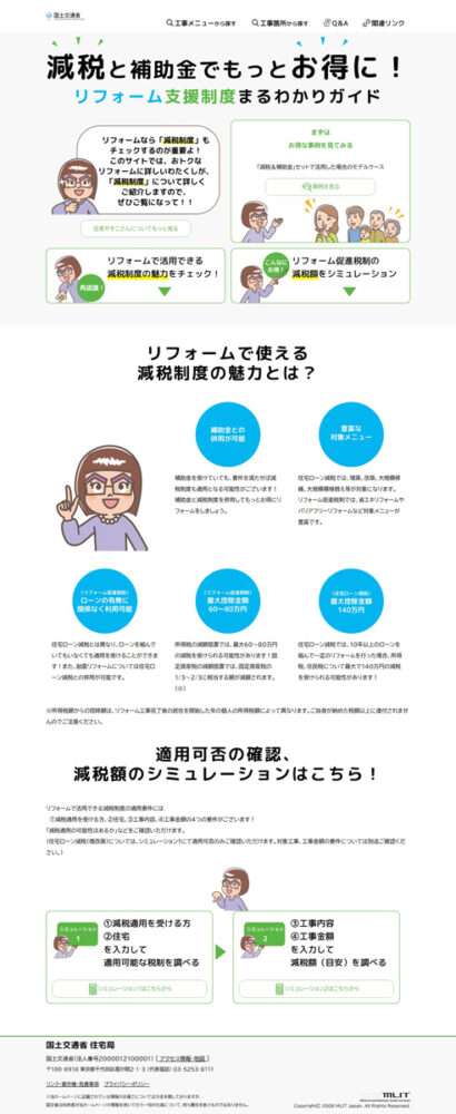 サイトでは主に、リフォーム促進税制(所得税、固定資産税の減税)、子育てグリーン住宅支援事業、リフォーム瑕疵保険などを紹介。事業者向けのコンテンツも設け、パンフレットや増改築等工事証明書の様式や、作成の手引きなどを掲載している。