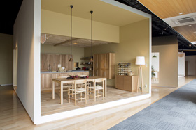 新ショールームでは同社の無垢キッチン「スイージー」を主体に、床・内装建具などとトータルコーディネートした全10タイプの空間展示をおこなう。