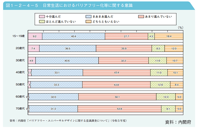 日常生活におけるバリアフリー化の進捗については、30歳代以下では「十分進んだ」「まあまあ進んだ」との回答が約5割だったのに対し、60歳・70歳代では「あまり進んでいない」「ほとんど進んでいない」との回答が6割強となった。この結果から、若者がイメージするバリアフリー化と、高齢者が実際に必要としているバリアフリー化とでは、認識に乖離(かいり)があることがわかる。