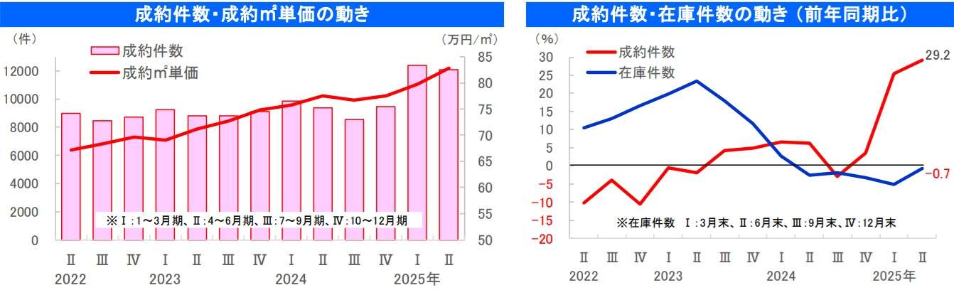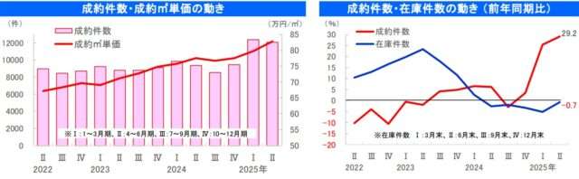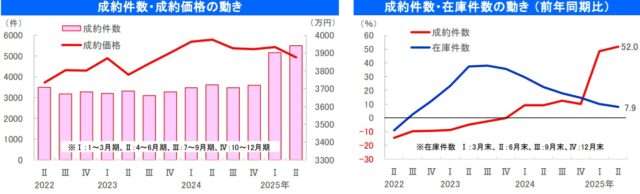 新規登録件数は、1万9800件で前年比7.9%増。在庫件数は、2万3341件で前年比7.9%増となった。新規登録価格は、4386万円で前年比2.5%増。前期比も1.3%上昇している。在庫価格は、4421万円で前年比1.7%増。前期比も1.3%上昇した。