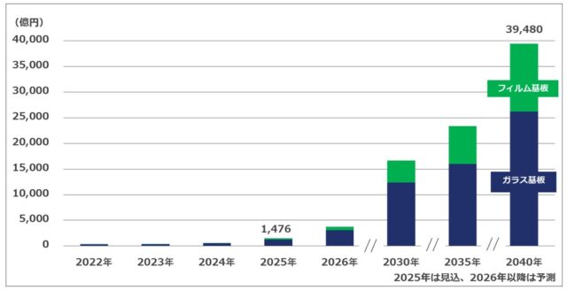 ペロブスカイト太陽電池は、軽量・柔軟性に優れたフィルム基板型と、既存の結晶シリコン太陽電池の生産ラインを活用できるガラス基板型に分類される。現在はガラス基板型が主流だが、将来的にはフィルム基板型がBIPV用途を中心に市場の3割以上を占めると予測されている。
