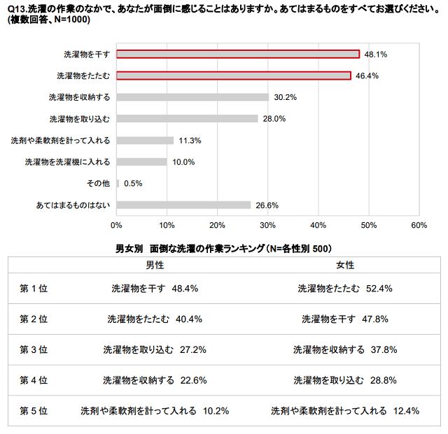 リンナイ(愛知県名古屋市)は7月23日、洗浄科学の専門家・横浜国立大学 大矢勝教授の監修のもと、全国の男女1000人を対象に実施した「洗濯に関する意識調査」の結果を発表した。洗濯のなかで面倒に感じる作業を聞いたところ、1位は「洗濯物を干す(48.1%)」、2位は「洗濯物をたたむ(46.4%)」だった。男女別でみると、男性は「洗濯物を干す(48.4%)」、女性は「洗濯物をたたむ(52.4%)」がそれぞれ最も多い。
