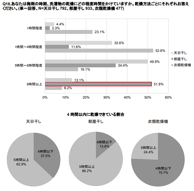 洗濯物の乾燥時間を干し方別にみると、「部屋干し」の半数が8時間以上かかっていることがわかった。4時間以内に乾燥できているのは、「天日干し」37%、「部屋干し」13.8%、「衣類乾燥機」75.7%だった。