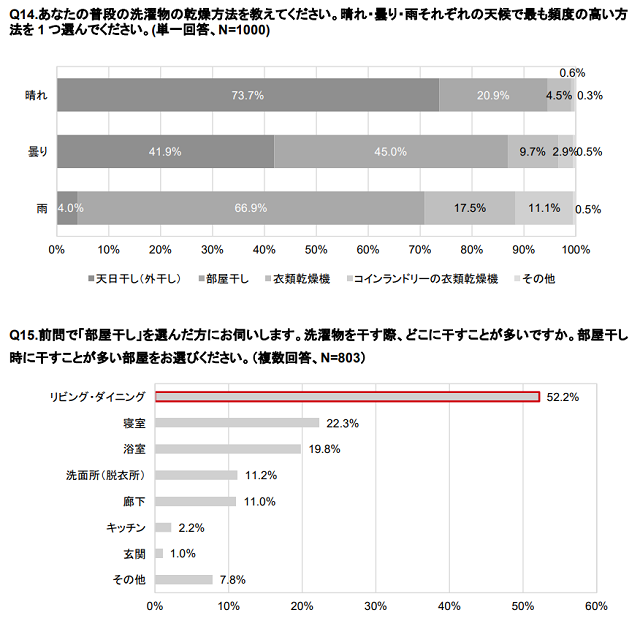 洗濯物の乾燥方法を天候別(晴れ・曇り・雨)に聞いたところ、晴れは「天日干し(73.7%)」、曇り・雨は「部屋干し(曇り:45.0%、雨:66.9%)」が最も多かった。なお、晴れても20.9%の人が「部屋干し」を選択している。