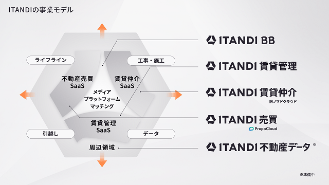不動産賃貸領域では、リアルタイム不動産業者間サイト「ITANDI BB」を中心に、賃貸管理の業務支援サービス「ITANDI 賃貸管理」、賃貸仲介の業務支援サービス「ITANDI 賃貸仲介」を展開。不動産売買領域では、不動産売買の業務支援サービス「ITANDI 売買 PropoCloud」を提供する。また、不動産データサービス「ITANDI 不動産データ」の準備を進めている。