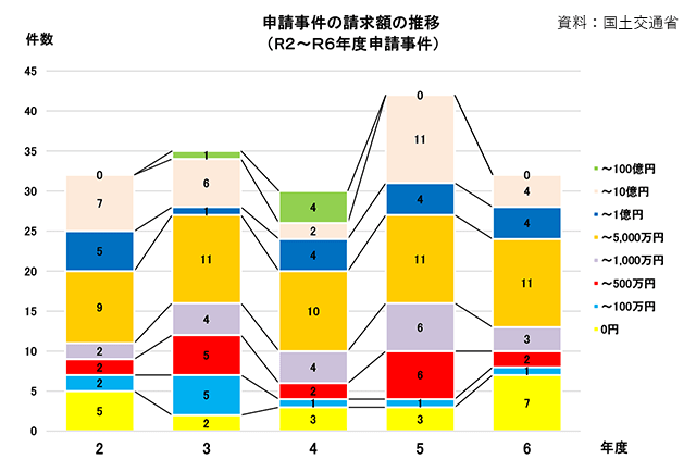 このうち国土交通省に設置された中央審査会への申請件数は32件で、前年度から10件減少。工事種類別では、「建築工事」19件、「設備工事」7件、「電気工事」と「土木工事」がそれぞれ3件となった。建築工事が減った一方で、設備工事と電気工事は増えている。請求額は「1000万円超~5000万円」の11件が最多で、「1億円超」の高額申請も4件あった。