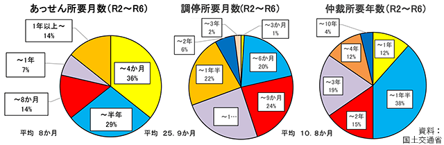 中央審査会における過去5年間の事件終了までの平均期間は、「あっせん」が8カ月、「調停」が10.8カ月、「仲裁」が25.9カ月だった。最も多かったのは、「あっせん」では4カ月未満、「調停」は7~9カ月、「仲裁」は1年~1年半だった。