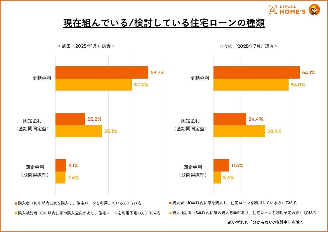 調査によると、購入者・検討者ともに「固定金利」の選択が前回(2025年1月)調査より増加。変動金利の選択率は購入者で64.1%(前回比-5.6pt)、検討者で56.0%(同-1.3pt)と減少しており、金利上昇への備えとして固定型へのシフトが進んでいる(下グラフ)。