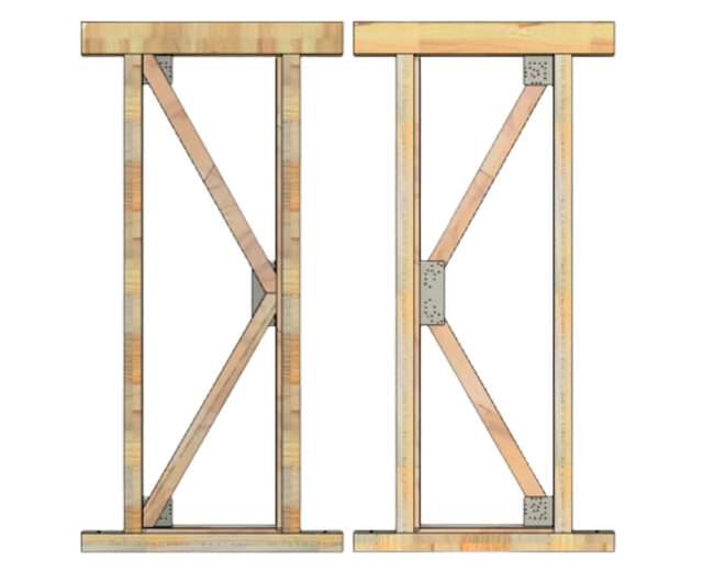 構造計算による設計では、5.84または6.38倍相当の耐力を発揮する。筋かいには国産材のLVLを使用し品質を担保。構造用面材を併用する必要がなく、小開口や壁体内収納を設けることもできるうえ、部材の切り欠きが不要。コンセントボックスや通排気口を設置できる。