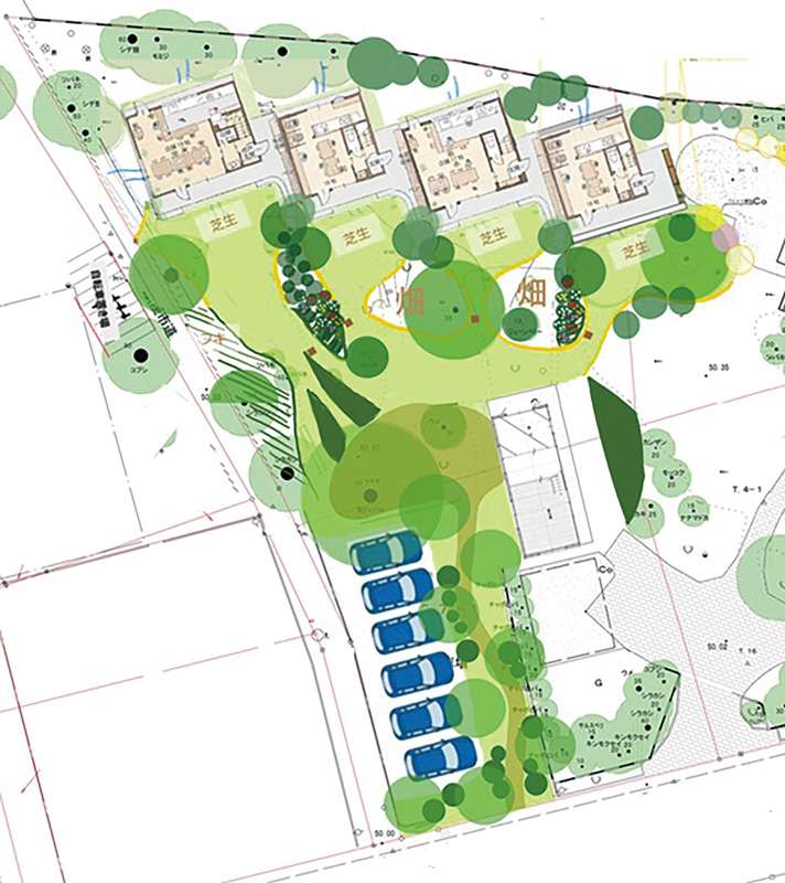 | 木造2階建ての4戸すべてに専用庭と駐車場が設けられ、さらに共同菜園、コモンガーデン、コモンハウスの”コミュニティ・ベネフィット”が享受できる | |