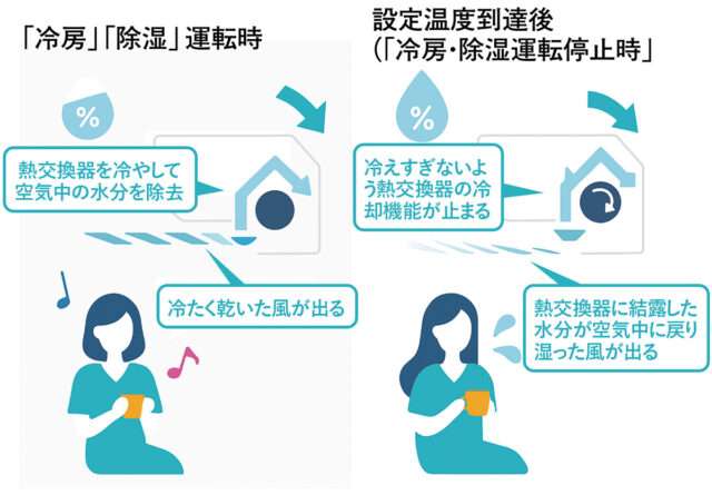[図1]「湿気戻り」のメカニズム。冷房・除湿運転が止まると熱交換機で結露した水が室内に放出されてしまう(三菱電機 「三菱ルームエアコン」ウェブサイトをもとに編集部作成)
