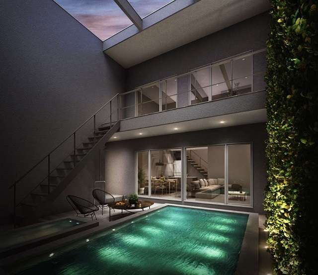 新江ノ島水族館や江ノ島が徒歩圏内の新モデルハウスでは、高さ6m超の緑化された壁で囲われたプライベートテラスで、温水プール、露天風呂、フィンランドサウナを楽しむことができる。屋外階段で2階の居室と1階のプライベートテラスを行き来することが可能。太陽光パネルとエアコン1台で1年中快適に過ごせる独自の全館空調システムを搭載し、屋内外がシームレスにつながる暮らしを体感できる。