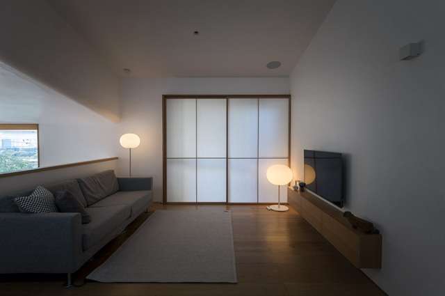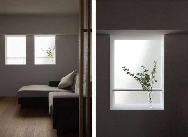 このお住まいはマンションのフルリノベーションですが、既存のアルミサッシュ引き違い窓の内側をあえていったん塞ぎ、改めて二連の小窓を設けることで大変美しい光空間を演出しています。写真に見えている透光不透視の面は既存サッシュの型ガラスです。