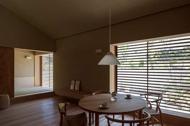下(写真7,8,9)のお住まいでも障子戸、簾(すだれ)戸、ガラス戸を三重に設けています。落ち着いた柔らかな明るさがほしいときには障子戸を、庭に落ちる日だまりを眺めたいときには簾戸を、そして外の庭を一体に感じたいときにはガラス戸を選ぶことで、外部とのさまざまなつながり方を楽しむことができます。