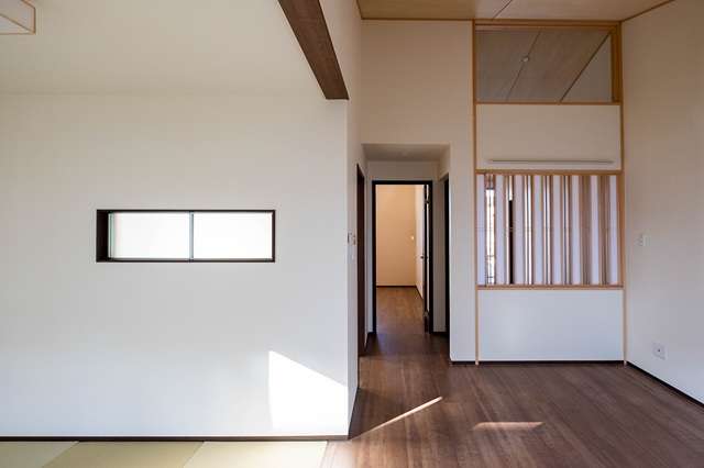 下(写真17,18,19)のお住まいは玄関と居間との間に室内の窓を設けています。この窓は無双連子(むそうれんじ)という大変凝ったしつらえで、縦長の紙障子が横にスライドすることで両側の部屋を柔らかく仕切ったりつないだりすることができます。