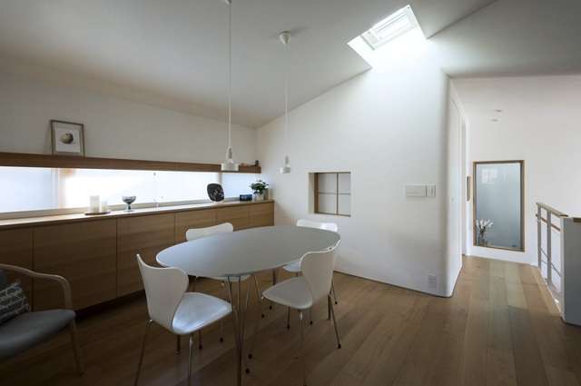 下(写真14,15)のお住まいでもハニカムスクリーンを効果的に用いています。ダイニングルームの幅いっぱいに細長い窓を設け、内側にハニカムスクリーンを設けています。勾配天井にもよくマッチした見事な透光不透視空間ですね!