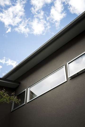 ちなみにこの窓は既製品のアルミサッシュを3つ並べたものです。下の外観写真のように中央にFIX窓、左右に横すべり出し窓を設けています。しかし室内からだと一体の光る面に見えてしまう、意外性に満ちたすてきな演出です。