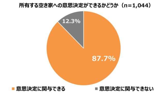 また、空き家の所有者または今後相続する予定の回答者のうち、対処についての意思決定に関与できる割合は87.7%。所有権の有無にかかわらず約9割が関与できるものの、活用や処分など具体的な対策を実行するまでには至っていないケースも多いことがわかる。