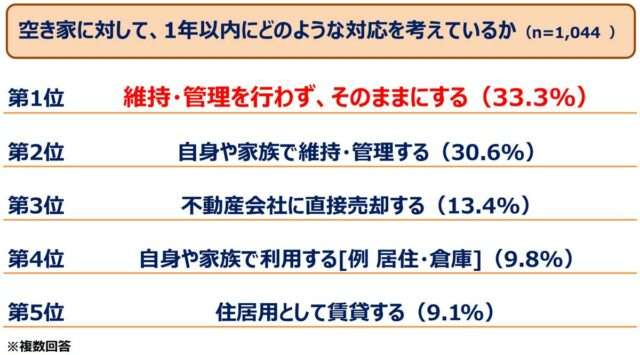 一方、1年以内に実行を考えている対応として売却や賃貸は少数にとどまり、「維持・管理を行わず、そのままにする」(33.3%)や「自身や家族で維持・管理する」(30.6%)といった消極的な対応が上位を占めた。同社は、意識と行動に大きなギャップがあり「行動に移す予定がある所有者は少数派にとどまっている」とした。
