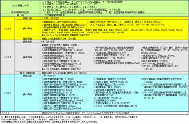 住宅建築関連技能者の能力評価はJBN・全国工務店協会、全国建設労働組合総連合(全建総連)、全国住宅産業地域活性化協議会(住活協)の3団体が策定。レベル2では2級技能士、レベル3では1級技能士の取得に加えて職長・安全衛生責任者教育の受講などを求める。最上位のレベル4では、さらに登録建築大工基幹技能者や建設マスター、「現代の名工」や技能グランプリでの受賞などが必要になる。