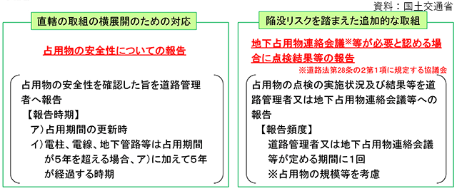 道路管理者への報告時期は、①占用期間の更新時、②電柱・電線・地下管路などで占用期間が5年を超える場合、③占有期間の更新後、5年が経過する時期。さらに道路陥没リスクを踏まえた取り組みとして、「地下占用物連絡会議」(※後述)などが必要と認める場合には、点検結果を年1回などの頻度で報告することとなった。
