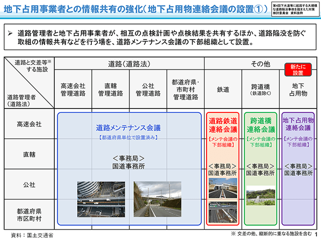 会議のメンバーは、対象施設の占用者と関係する道路管理者で構成。対象施設は、高速道路、直轄国道、公社道路、補助国道、都道府県道、市町村道に関係する道路地下の鉄道施設、通信関係施設、電力関係施設、ガス関係施設、上下水道施設などとなっている。