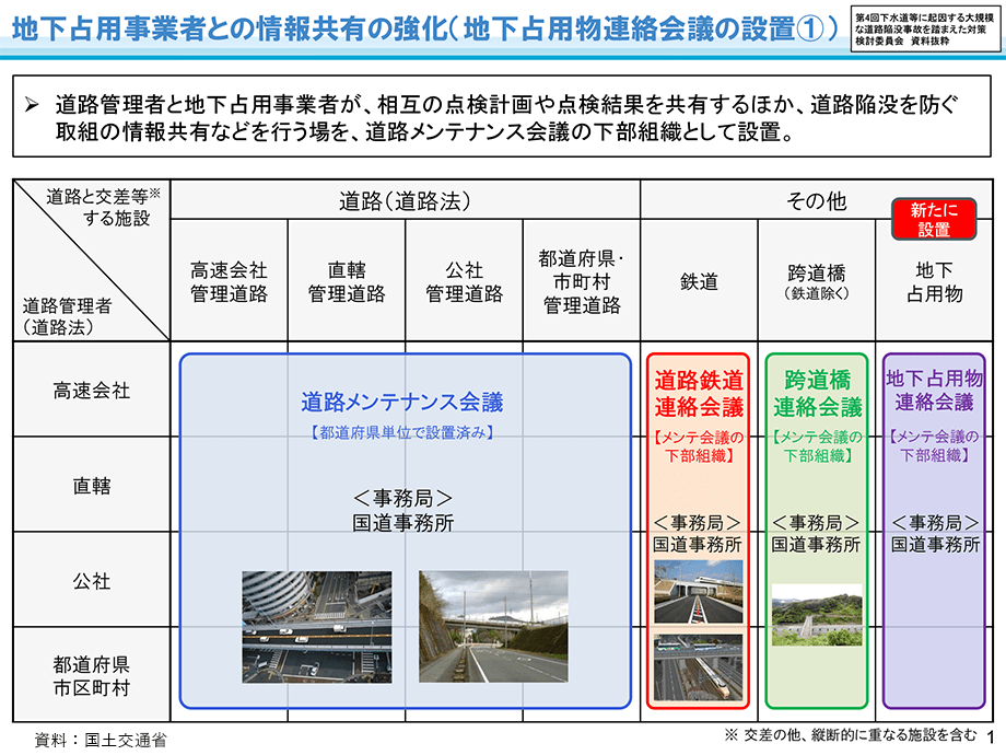 こうした状況を受け国交省では、直轄国道の道路利用者や第三者への重大事故を未然に防止する観点から、今年4月に「道路メンテナンス会議」の下部組織として「地下占用物連絡会議」を新たに設置。道路管理者と地下占用事業者が、道路陥没を防ぐ取り組みなどについて情報共有を行う場を設けた。今回の規則改正により同会議は、点検計画や点検結果を共有する場としても機能する。