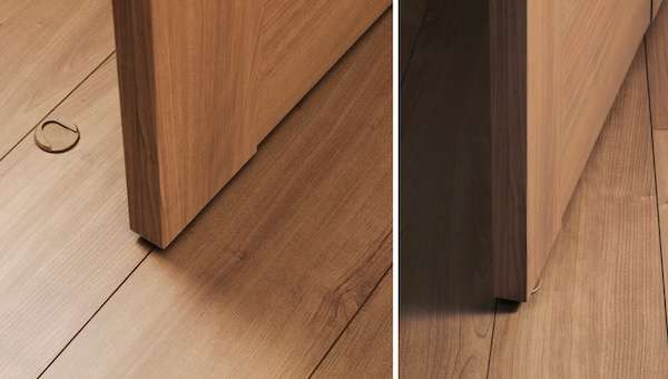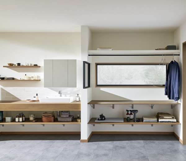 このほか、凹凸感のない納まりで本体吊り込みが1人でできる「シークレットヒンジ(隠し丁番)」、開けても閉めてもすっきりとした見た目の「シークレットドアストッパー」、さまざまな場所に対応する「耐水メラミンカウンター」をラインアップする。