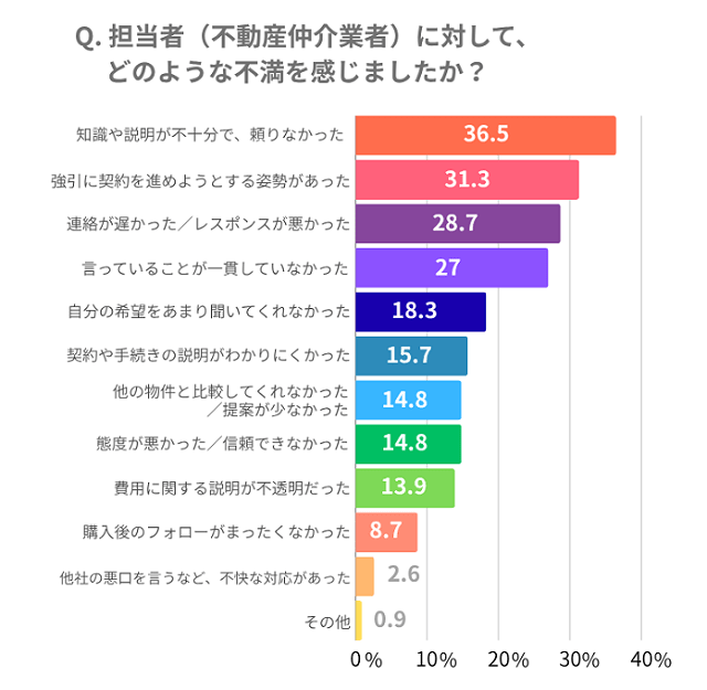 住宅購入者のうち、「担当者に対して不満を感じたことがある」人は約6割で、最も多かったのは「知識や説明が不十分で、頼りなかった(36.5%)」だった。次いで「強引に契約を進めようとする姿勢があった(31.3%)」「連絡が遅かった/レスポンスが悪かった(28.7%)」となった。担当者の専門性や倫理観、営業スタイルに不満を感じていることがわかる結果となった。