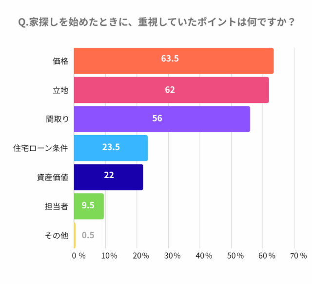 家探しの際に重視するポイントは、「価格(63.5%)」、「立地(62.0%)」、「間取り(56.0%)」が上位を占め、「担当者」を選んだ人は全体の9.5%にとどまった【グラフ1】。