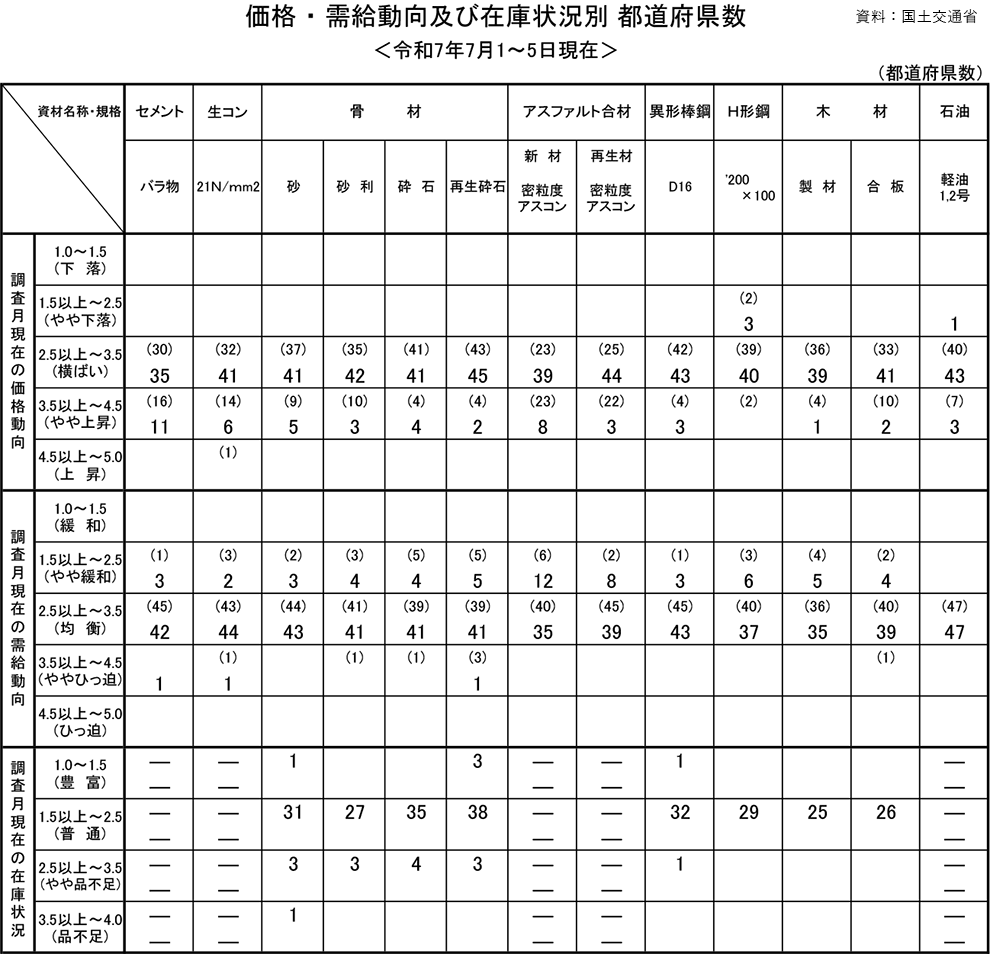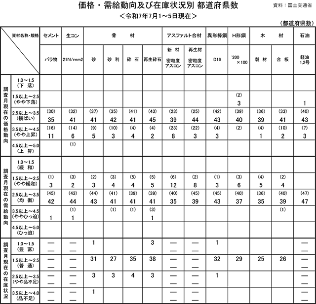 国土交通省が7月25日発表した「主要建設資材需給・価格動向調査結果」(7月1~5日に実施)によると、価格動向はすべての資材で「横ばい」となった。需給動向はすべての資材で「均衡」、在庫状況はすべての資材で「普通」となり、いずれも前月から大きな変動は見られなかった。