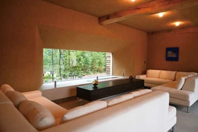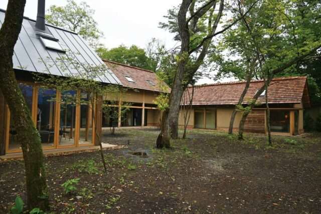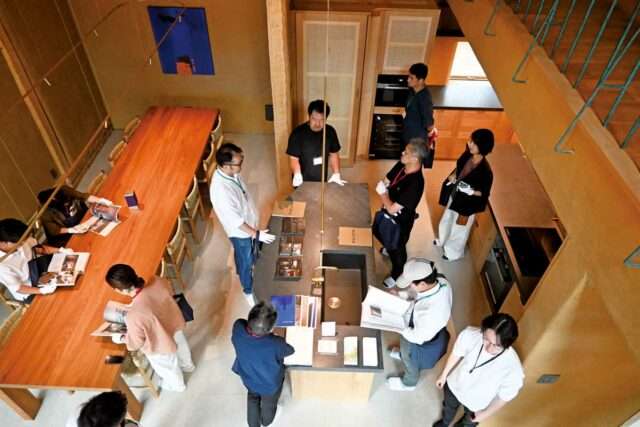手加工で仕上げた大径の丸太(クリ材)を組み上げた構造フレーム(柱・梁)をあらわしにし、土や石など自然素材をふんだんに用いたラスティックモダンな空間が特徴。参加者は「こんな空間は初めて見た」と驚きつつも、菱田さんに直接、美意識や設計哲学などについて質問しながら、ディテールなどを丹念に観察していた。