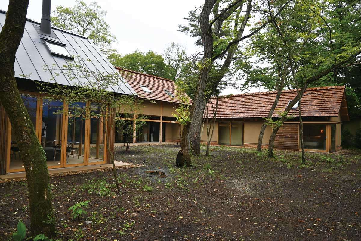 初日はツアーの目玉として、軽井沢町に建てられた同社の設計・施工による区分所有型別荘を視察した。販売総額5億円超の木造2階建て・延べ床面積約270㎡。同社代表で大工アーティストとして国内外で活動する菱田昌平さんが、15~16世紀のベルギー古民家をモチーフにデザインした「ティンバー」スタイルの建物だ。