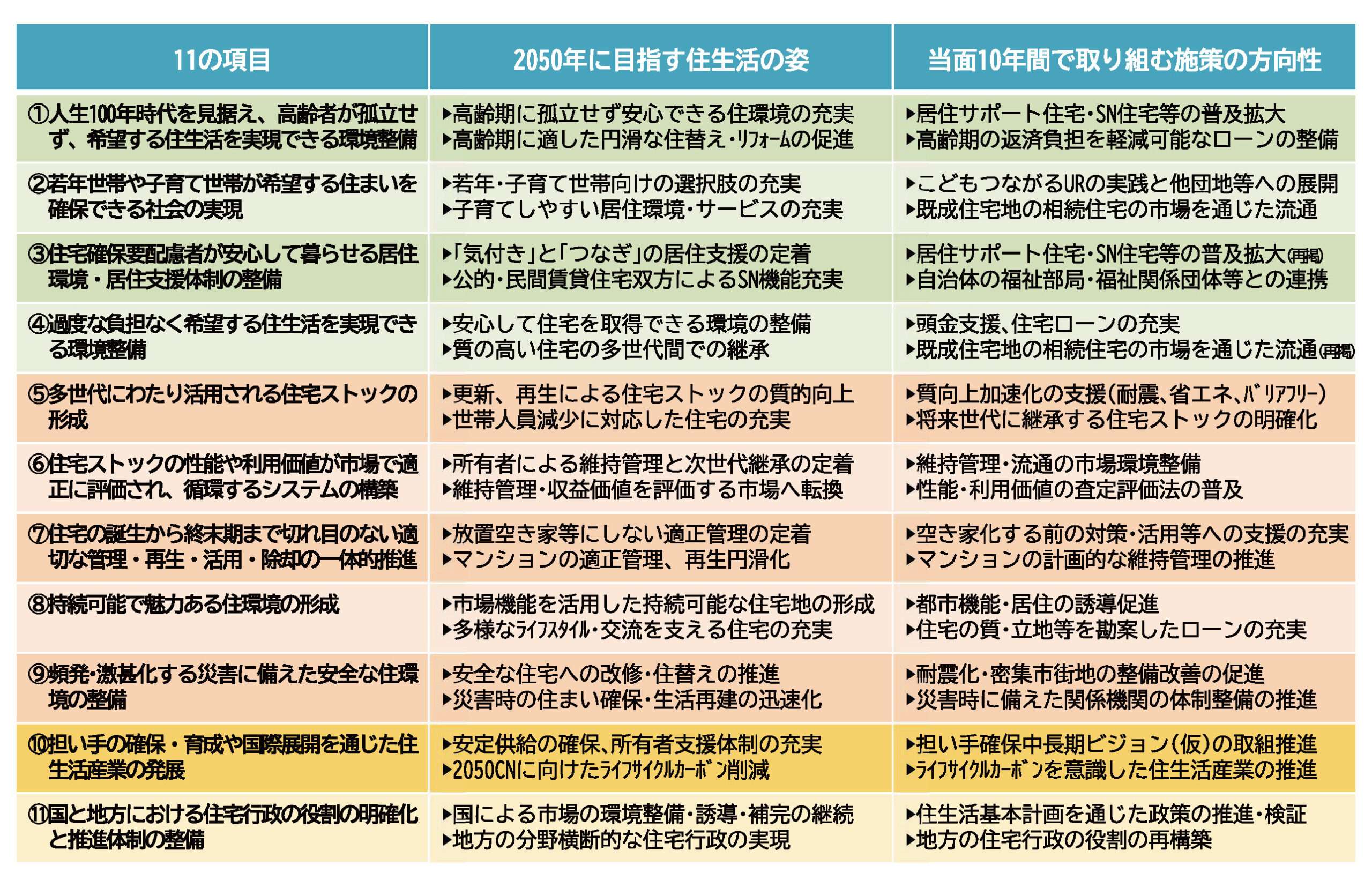 国土交通省の社会資本整備審議会住宅宅地分科会(分科会長=大月敏雄・東京大学大学院教授)は7月30日の第65回会議で、住生活基本計画の改定に向けた中間とりまとめの素案を提示した。若年・子育て世帯の住宅取得や経済的負担の軽減、ストック活用などの11項目で、2050年に目指す住生活から逆算した、当面の10年間(2035年まで)に取り組む施策の方向性などをまとめた[図]。
