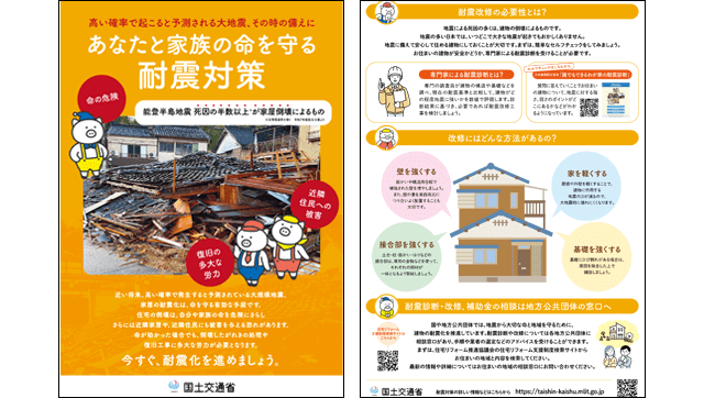 主なコンテンツは、▽テレビCM動画「家族を守る、家を守る。耐震改修」▽インタビュー「リタイア夫婦の2人暮らしを支える家」▽子ども向け絵本「さんびきのこぶたの50年後のおはなし」▽耐震改修の必要性(過去の大地震の被害)▽耐震改修の進め方▽耐震セルフチェック「誰でもできるわが家の耐震診断」▽耐震改修の専門家の選び方(住宅リフォーム事業者団体登録制度)▽補助金・支援制度の紹介―など。配布用のチラシなども掲載している。