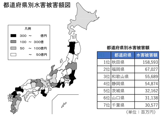 国土交通省は7月31日、2023年の水害被害額(確報値)を公表した。これによると被害総額は約7100億円となり、過去10年間で3番目の規模となった。都道府県別では秋田県で過去最大の被害額となっている。上位3県の被害額は、「秋田県」1590億円、「福岡県」670億円、「和歌山県」560億円だった。