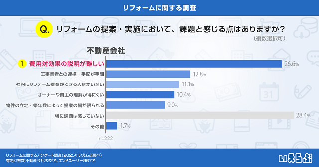 不動産会社側も「リフォームの提案・実施」の課題として、「費用対効果の説明が難しい」(26.6%)、「社内にリフォーム提案ができる人材がいない」(11.1%)をあげており、エンドユーザー・不動産会社ともに価格に関する情報不足が悩みとなっている実態が明らかとなった(下グラフ)。