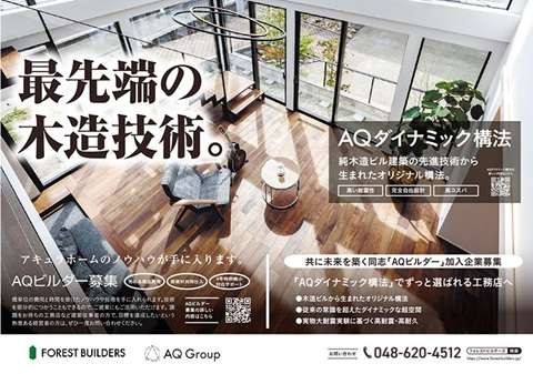 AQグループ(埼玉県さいたま市)は、専用の高倍率耐力壁などを用いて、耐震性を確保しながら大空間に対応できる新構法「AQダイナミック構法」を、同グループが主宰する全国工務店ネットワーク「AQビルダー」を通じて展開している。
